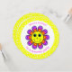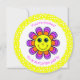 O convite de aniversário de uma garota bonita apresenta um rosto amarelo de esoji com pétalas laranja, rosa e púrpura e olhos azuis e uma bolinhas amarela e branca. O texto da frente diz "Você é convidado para uma festa surpresa". A parte traseira do cartão tem detalhes para personalizar.