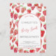 Bonita e moderna cor de água, convite de aniversário doce de morango. A parte traseira apresenta um padrão de morango correspondente para uma ajuda extra da cutena. Personalize o texto para se adequar à sua celebração. Arte original de Nic Squirrell