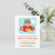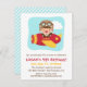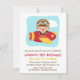 Um convite colorido e divertido com um menino fofo em aviador armado de óculos grandes e chapéu balançando sua mão enquanto voa um pequeno avião vermelho e amarelo entre as nuvens. No verso estão as listras brancas e azuis inclinadas. Personalize facilmente com os detalhes da sua festa para a festa de aniversário temida do avião!