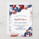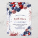 Um fundo branco chic. Decorado com balões patrióticos coloridos em azul vermelho e branco. Personalize e adicione um nome e detalhes da parte. O nome é escrito com um script de estilo manuscrito.