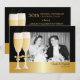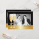 Celebre o casal feliz com uma foto original do casamento na frente deste adorável convite dourado e preto. Este Aniversário de 50 Anos de Casamento apresenta elegantes taças de champanhe borbulhante, amarradas de forma bonita em laços dourados brilhantes em homenagem ao seu aniversário de ouro.