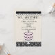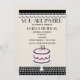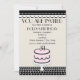 Um convite de aniversário com um esquema de rosa claro, preto e branco. Fundo bege e papel metálico champanhe. Ilustração de um bolo de aniversário cor-de-rosa e preto no fundo, sentado sobre um pé de bolo branco e um bolo branco com toalha de bolinhas preta. O topo tem borda recortada em preto e branco. O texto é preto. Personalize com detalhes de sua ocasião e envelheça no bolo.