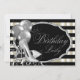 Mulheres convites de aniversário pretas, marfim e prata com elegantes calçados de salto alto e brilho prateado e balões prateados num lindo fundo de marfim e faixa preta. Este elegante marfim, convite de aniversário preto e prateado é facilmente personalizado para o seu evento simplesmente adicionando os seus detalhes no estilo de letra da sua escolha. Este é um design impresso sem brilho real, etc.