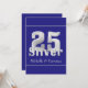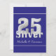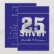 Uma cor azul real profunda e brilhante é o fundo para este lindo convite de celebração de aniversário de casamento prateado. Um grande 25 prateado e o texto Prata decoram o meio da frente, com os primeiros nomes do casal abaixo em cinza prateado. Linhas finas prateadas bordam a parte superior e inferior. O verso do convite é azul real correspondente, com o seu texto personalizado em cinza prateado. Dramático e lindo!