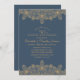 Convites Elegantes de Aniversário de Casamento de 50 anos Azul Marinho com Estilo Dourado. Personalizados com os detalhes da sua celebração. Característica de renda com aparência dourada e tipografia em fundo azul marinho. Se desejar, você pode facilmente alterar as cores do fundo e do texto. Este convite de aniversário de casamento foi projetado por http://www.superdazzle.com