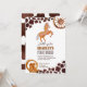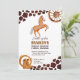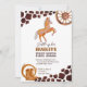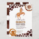 O primeiro rodeio ocidental sela convite de aniversário modelo de cavalo para cima instantaneamente. Cavalo-bebê-palomino castanho, uma roda, corda e botas-de-vaqueiro, padrão-vaca, fonte de vintagem ocidental e moderna escrita de pincel.