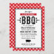 O convite de aniversário para o CHURRASCO/churrasco casual apresenta um motivo de porco, texto preto para carvão personalizado de na moda em fontes ocidentais e modernas, sotaques de estrelas e um design de borda de xadrez de chambão vermelho.