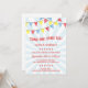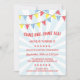 Este convite de festas divertido de aniversário de criança com temática circense apresenta um revestimento transparente com padrões, texto vermelho e uma explosão azul clara no fundo.