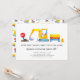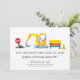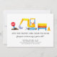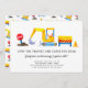 Um cartão de convite de aniversário de criança, de tema de construção bonito, com ilustração de caminhões de construção e cartazes. O texto diz "pare o trânsito e feche a estrada".