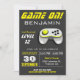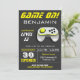 Este convite para o aniversário de criança moderno apresenta um controlador de vídeo game amarelo e branco brilhante e uma tipografia moderna. Basta adicionar os detalhes do seu evento neste modelo fácil de usar para torná-lo um convite de tipo único. Sacudir a placa para mostrar um padrão de listras amarelo e cinza na parte traseira da placa.