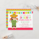 Celebre um aniversário de criança com uma Fiesta Mexicana colorida! Este convite é perfeito com a sua brilhante escolha de cores como vermelho, azul, verde e amarelo. Ele apresenta uma garota bonita com uma cauda de pônei vestindo um chapéu mexicano sombrero, largo, com interessante padrão geométrico e de listras. A garota está tremendo um par de maracas para a música. O banner de Bunting está no fundo. A página inversa é colorida e impressionante padrão ziguezague cebola.