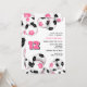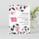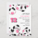 Este convite de festas de tema de futebol bonito apresenta clusters de bolas de futebol cor-de-rosa, preto e branco nas bordas superior e inferior na frente e um cluster de solteiros que cobre a parte de trás do convite - personalize os detalhes da parte em um fundo branco - por katz_d_zynes