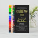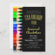 Este design convite de festas divertido apresenta uma coluna de lápis de cor d'água do arco-íris. Todos os detalhes da parte estão na frente com cor de fonte amarela para a parte e informações de nome. Preencha os campos de texto modelo em personalizar, remova qualquer informação ou clique em personalizar para selecionar um estilo de fonte, tamanho e cor preferidos.