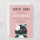 Convite de aniversário chic de cor rosa com um gato bonito vestindo um colar de pérolas turquesa e um arco, um confete branco, e FESTA TIME escrito em letras grandes e pretas para caligrafia.