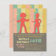 Um convite de festas de moda e na moda numa paleta colorida da velha escola com traços de silhuetas de meninas em roupas retrô de brincos grandes e cabelos que incluem afro. Formas decorativas de círculos, estrelas e notas musicais. Excelente para festas de aniversário adolescentes onde gostam de brincar vestidos na era dos anos 70. Personalize facilmente com os detalhes do seu partido.