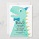 Um belo convite de aniversário para a festa do dinossauro do seu filho! Ilustração no estilo de desenho de um dinossauro verde com picos amarelos. O T rex está vestindo uma gravata azul de arco e um pequeno chapéu de festa. Você pode adicionar as informações da festa no corpo do dinossauro. O texto é facilmente editável on-line.