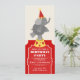 Um convite de aniversário para crianças apresentando uma ilustração de um elefante vestindo um chapéu de festa e em pé em uma plataforma. Personalize o texto sobre o tíquete vermelho na frente e atrás.