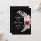 Este elegante convite de aniversário da flora apresenta uma flor rosa-rosa-burro com folhas e um arranjo verde num pano de fundo preto.