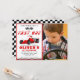 Convite de aniversário De Foto De Carro Vermelho E Cinto. O Texto Diz "Nossa Pequena Corrida É Rápida"