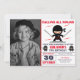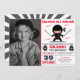 Incomode seus convidados com este moderno convite de aniversário temático ninja apresentando pequenos ninjas bonitinhos com tipografia ocular contra um fundo branco. Basta adicionar os detalhes do seu evento neste modelo fácil de usar e adorar este cartão com a foto favorita do seu filho para torná-lo um convite generoso. Sacudir a placa para revelar um padrão elegante de starburst na parte traseira da placa.