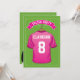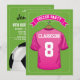 Convites de festa de aniversário com tema de futebol com um fundo de campo de futebol verde, uma camisa esportiva rosa com seu nome e número, uma bola de futebol e um modelo de festa moderno.