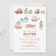 Convite de Watercolor para o aniversário de um menino. Com um carro vermelho e azul, moto, trem, navio, helicóptero, navio, avião e foguete.