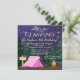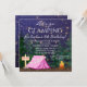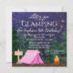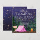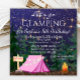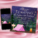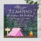 Convites de festa de aniversário de glamping para meninas com uma linda tenda rosa e fogueira em um fundo de floresta noturna estrelada. Estes convites de festa de aniversário de camping para meninas são facilmente personalizados para o seu evento, basta adicionar seus detalhes no estilo de letra e texto de sua escolha.