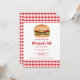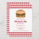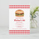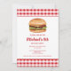 A ilustração de Destei de um hambúrguer que tem um pãozinho de sementes de sésamo cheio de queijo, alface, carne bovina, tomate, ketchup e picles. O fundo tem um padrão de gingham vermelho. Personalize o texto com os detalhes do seu evento.