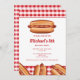 A rápida ilustração de comida de Destei de um pãozinho de cachorro-quente com uma salsicha grelhada que tem um pouco de ketchup e mostarda no topo. O fundo tem um padrão de gingham vermelho. Personalize o texto com os detalhes do seu evento.