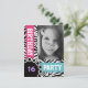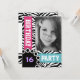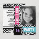 Um design de padrão de zebra preto e branco muito moderno e na moda, que funciona bem com fotografias pretas e brancas de sua filha celebrando seu doce 16º aniversário! O alto contraste ou fotos coloridas seletivas também pareceriam nítidas! Este design apresenta bandas cor-de-rosa-quente e azul-elétrico, texto de letras grandes e padrão de impressão zebra selvagem para o desenhar de atenção para a parte mais importante da página - sua aniversariante! Convide todas as amigas dela para uma doce celebração de 16 anos ou qualquer adolescente ou festa de aniversário adolescente com este cartão bonito feminino, de alta moda e de tendências.
