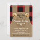 Camisa flanela de xadrez de lenhador adorável e macacões Khaki com um pirulito no bolso de trás, convite de aniversário de criança. Convite de aniversário à porta, perfeito para temas de aventura, lenhador e fazenda.