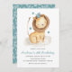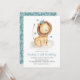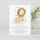 Convite de aniversário bonito e branco apresentando um leão de aquarela doce vestindo uma coroa sentada com estrelas ao fundo. Personalize o convite de aniversário adicionando o nome, a idade e os detalhes da festa da criança. O reverso dos convites apresenta um fundo de folhagem pintado. Os convites de festas de aniversários temáticos do livro de histórias são perfeitos para os rapazes!