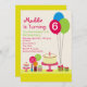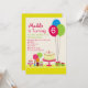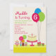 Um convite de aniversário com uma ilustração de bailes, presentes, um bolo de aniversário, um doce e um cupcake cor-de-rosa com um esquema de cores femininas. Personalize o texto com detalhes da sua ocasião.