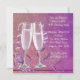 Convite de festa de aniversário de mulher elegante com roxo, brilho rosa neon, fitas e taças de champanhe e salto alto. Este convite de festa de aniversário rosa neon e roxo é facilmente personalizado para o seu evento adicionando detalhes do evento, estilo de fonte, tamanho e cor da fonte e texto.