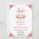 Este convite de aniversário elegante e festivo apresenta uma banca de bolo com biscoitos de gengibre, macarões, doces, cacau quente e bule de chá. Nos cantos estão lindas flores rosa de poinsettia. O texto combina o script manuscrito e as fontes sans serif para uma aparência na moda e moderna. Isto é perfeito para um brunch de Natal ou uma festa de chá.