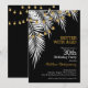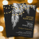Frentes de palmeiras brancas com fios de luz dourada sobre fundo preto, são convites de festas de aniversários divertidos para qualquer idade, apenas mude os detalhes. Consulte os itens CORRESPONDENTES na nossa coleção.