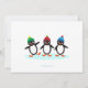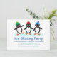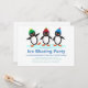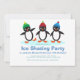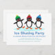 Três pinguins giros em bonés de cores primárias de lã estão deslizando ao redor desse brilhante e feliz convite de aniversário de patinação de gelo no tema.