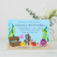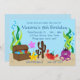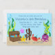 Esta linda convite de aniversário personalizável mostra uma cena debaixo do mar com um cheio de presentes no peito do tesouro, um polvo e um chapéu de um caranguejo vestindo, e um peixe-estrela segurando um balão.