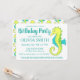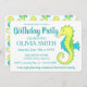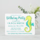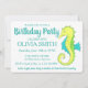 Os convites apresentam um marcador original ilustrativo de um cavalo-marinho verde e amarelo giro, com texto azul. Apenas personalize para um divertido aniversário ou convite de festas de praia. Não vê o que está procurando? Precisa de ajuda para a personalização? Entre em contato com Rebecca para ter algo projetado só para você.