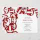 Este convite de festas temático de vôlei apresenta volicola vermelha e branca em cluster nas bordas esquerda e superior na frente e um cluster de solteiros cobrindo a parte posterior do convite - personalize os detalhes do partido em coordenação de cores em fundo branco - por katz_d_zynes