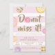 O que mais poderia sonhar com uma garota do que uma festa de rosquinha! Coloque a cena com este convite de festas de aniversário super fofo, com faixas cor-de-rosa com borrão em negrito, sobrepostas com rosquinhas de cor d'água e texto dourado falso. Um tipográfico divertido "rosquinha não!", completo com rosquinha rosa, manchou o convite. O inverso também apresenta as faixas de pincel cor-de-rosa pinceladas.