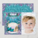 Convite de festa de aniversário de sereia com adorável princesa sereia loira de cabelo claro em uma linda concha de pérola em um belo fundo brilhante rosa, roxo e azul turquesa. Este convite de festa de aniversário de sereia loira é facilmente personalizado para o seu evento, basta adicionar seus detalhes e foto. Este é um design impresso sem brilho real, pérolas, etc.