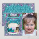 Convite de festa de aniversário de sereia com uma adorável princesa sereia bebê morena em uma linda concha de pérola em um belo fundo cintilante rosa, roxo e azul turquesa. Este convite de festa de aniversário de sereia morena é facilmente personalizado para o seu evento, basta adicionar seus detalhes e foto. Este é um design impresso sem brilho real, pérolas, etc.