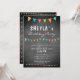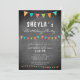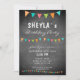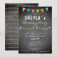 Convite de aniversário de bandeira colorida de bunting do quadro-negro moderno. O design tem bandeiras de revestimento de festa de aniversário em cores vermelhas, azuis e verdes em uma textura de quadro de cinza escura. O texto é uma tipografia branca moderna - personalize este convite de aniversário com os seus dados e faça o seu próprio cartão de aniversário. Excelente para crianças, rapazes ou raparigas e para qualquer outra pessoa.