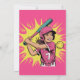 Uma ilustração vibrante de pop de arte mostra uma jovem médio balançando num jogo espiritado de softball. A menina, irradiando energia jovem, está vestida em uma camisa rosa brilhante com o número "7" exibido de forma destacada, e um sorriso determinado acende seu rosto enquanto ela segura um taco teal, pronto para se conectar com o softball. O fundo dinâmico explode com espirais e formas enérgicas, amarelas e cor-de-rosa, ao estilo do grafite, criando uma sensação de movimento e entusiasmo ao redor da menina. A luz do sol suave e difusa banha a cena, acentuando as cores ousadas e a estética lúcida enquanto ilumina o softball suspenso no ar do médio perto do morcego.
