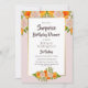 Um convite de festas de janto de aniversário de surpresa floral cor-de-rosa e laranja.