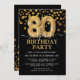 Convite de aniversário moderno de preto e ouro para alguém que faz oitenta anos! Apresentando um fundo preto, faux gold glitter confetti, balões de 80 de ouro e um elegante modelo de aniversário que é fácil de personalizar.