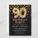 Convite de aniversário de surpresa moderno, preto e ouro, para alguém a fazer noventa anos! Apresentando um fundo preto, faux gold glitter confetti, balões de 90 de ouro e um elegante modelo de aniversário que é fácil de personalizar.