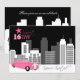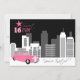 © Socialite Designs. Um convite de festa de aniversário de 16 anos doce com uma limusine rosa divertida na cidade. Personalize com as informações da sua festa.