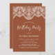 Convide convidados para o seu evento com este convite de aniversário personalizável. Ele apresenta uma elegante garland de rendas brocadas em um fundo de terracota. Personalize adicionando seus detalhes. Este convite de aniversário de rendas é perfeito para qualquer tema ou estação de eventos.
